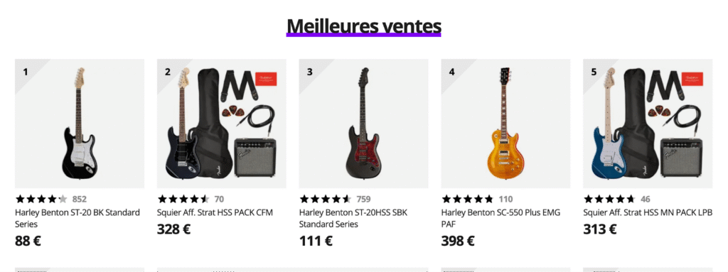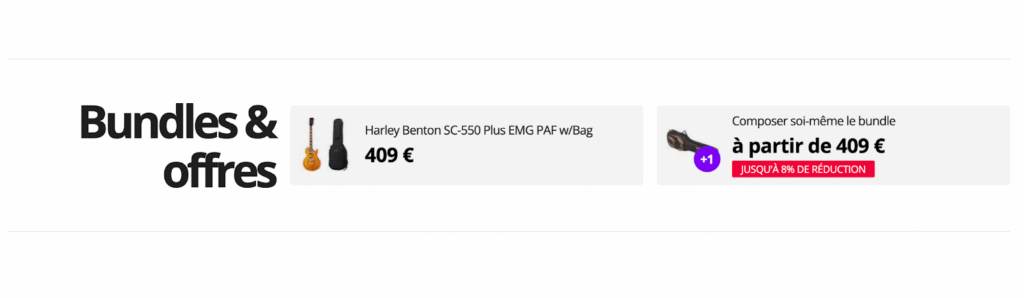 - Le pack découverte : plusieurs produits d’une gamme à prix attractif, parfaits pour faire tester votre catalogue (une guitare, une housse et un amplificateur) ;