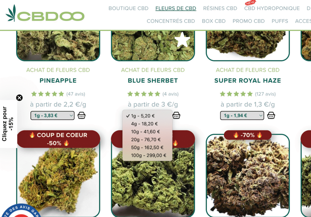 - 1 gramme de Blue Sherbet acheté coûte 5,20 €, en commander 100 grammes revient à 299 € au lieu de 520 €.